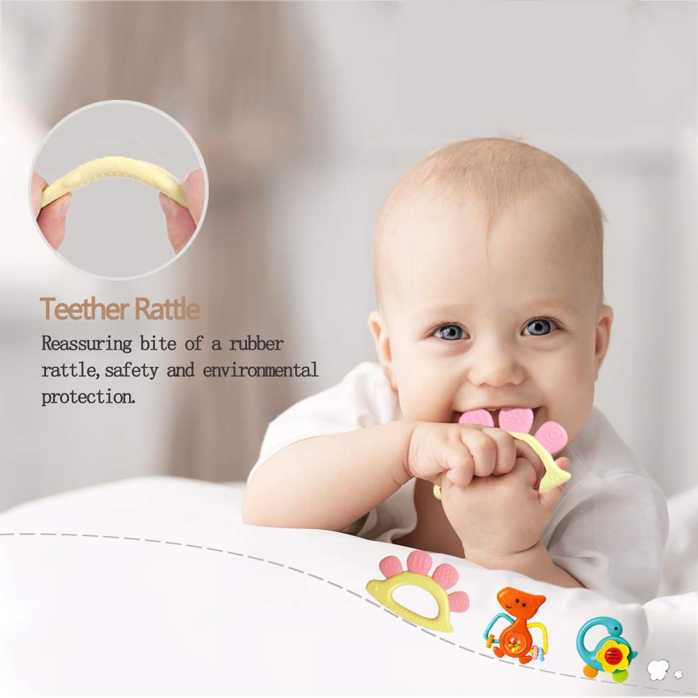 Yiosion Baby Rattles and Teethers, Newborn Baby Teething Toy Set, Baby Shakers, Grab Spin Rattles, Musical Toy Set, Early Educational Toys Gifts for 3, 6, 9, 12 Month Baby Infant Newborn Boys and Girls 2 in1 BABY RATTLE TEETHERS Great teething toys. BPA FREE, 100% Food Grade Plastics. The first year of life is crucial for the development of your baby’s senses, fine motor skills. Babies develop an awareness of the world around them through vision, hearing, touch, learn how to control their fingers and hold different objects. This set of rattles features a range of colors, sounds and teething materials to suit baby’s needs at different stages of their development.Suitable for baby toddler newborn age 3 months old up. GREAT BABY GIFT The rattle toys with bright color, design with cute animal and rattle sound can help develop baby's colors, shapes and animals recognition.This infant toys designed with a hanging ring for easily hanging in stroller and bed,that would be the best gift for your baby birthday and Christmas gift.Perfect gift for baby newborn infant birthday gift, suited for baby newborn 3 months+, baby toys 3-6 months, baby toys 6-12 months, baby toys 3-6 months, infant toys 3months and up. Ideal Christmas Gift or just as a New Year Gift for Newborn Babies Toddlers Girls Boys. This cute pre-kindergarten toy can be dropped from dining table multiple times. Highly recommend it! Hand-eye coordination : The ergonomic handle encourages baby to grasp and strengthens the hand muscles. Paint-free : Non-toxic, paint-free design allows your baby to chew on the rattles. Teething toy : A gum-friendly material that encourages the development of healthy teeth. Baby can chew on the rattle to relieve teething pain. Fine motor skills : All this age, babies learn how to hold objects between their fingers. Ergonomic design : Each rattle is designed to make it easy to hold.